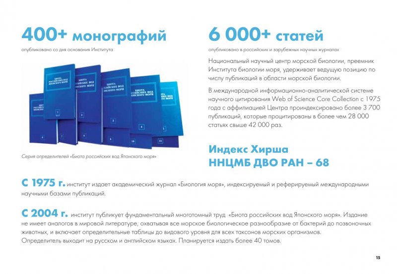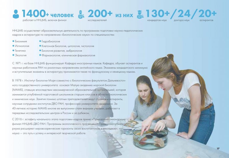Презентационный буклет расскажет вам о нашем Центре, обо всех возможностях, предоставляемых здесь. ННЦМБ ДВО РАН сегодня – это уникальный научно-исследовательский комплекс, имеющий большой авторитет в России и за рубежом и занимающийся актуальными проблемами в области биологического разнообразия и экологии, молекулярной и клеточной биологии, биохимии, генетики, биологии развития, биотехнологии, фармакологии, биомедицины на всех уровнях организации живой материи.